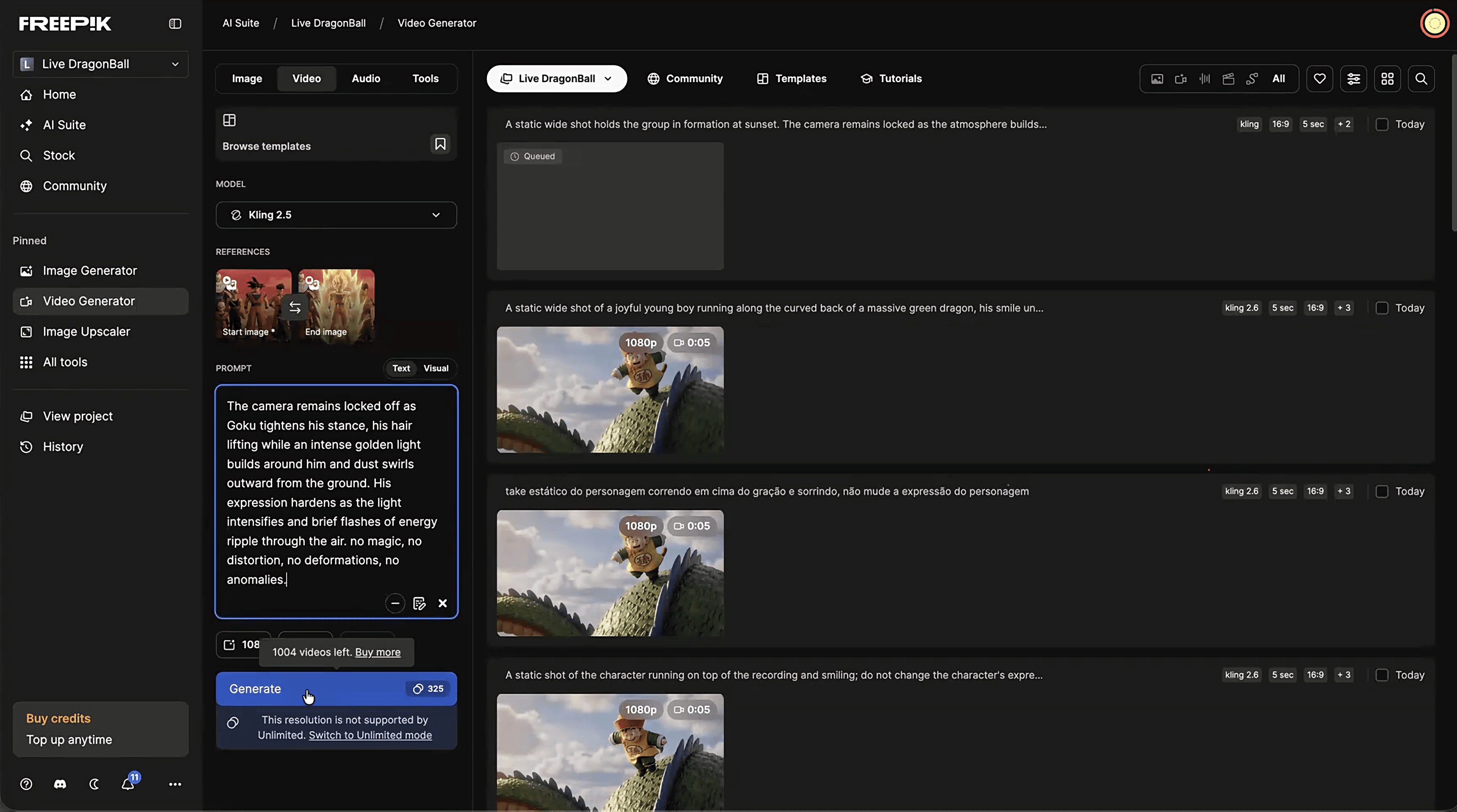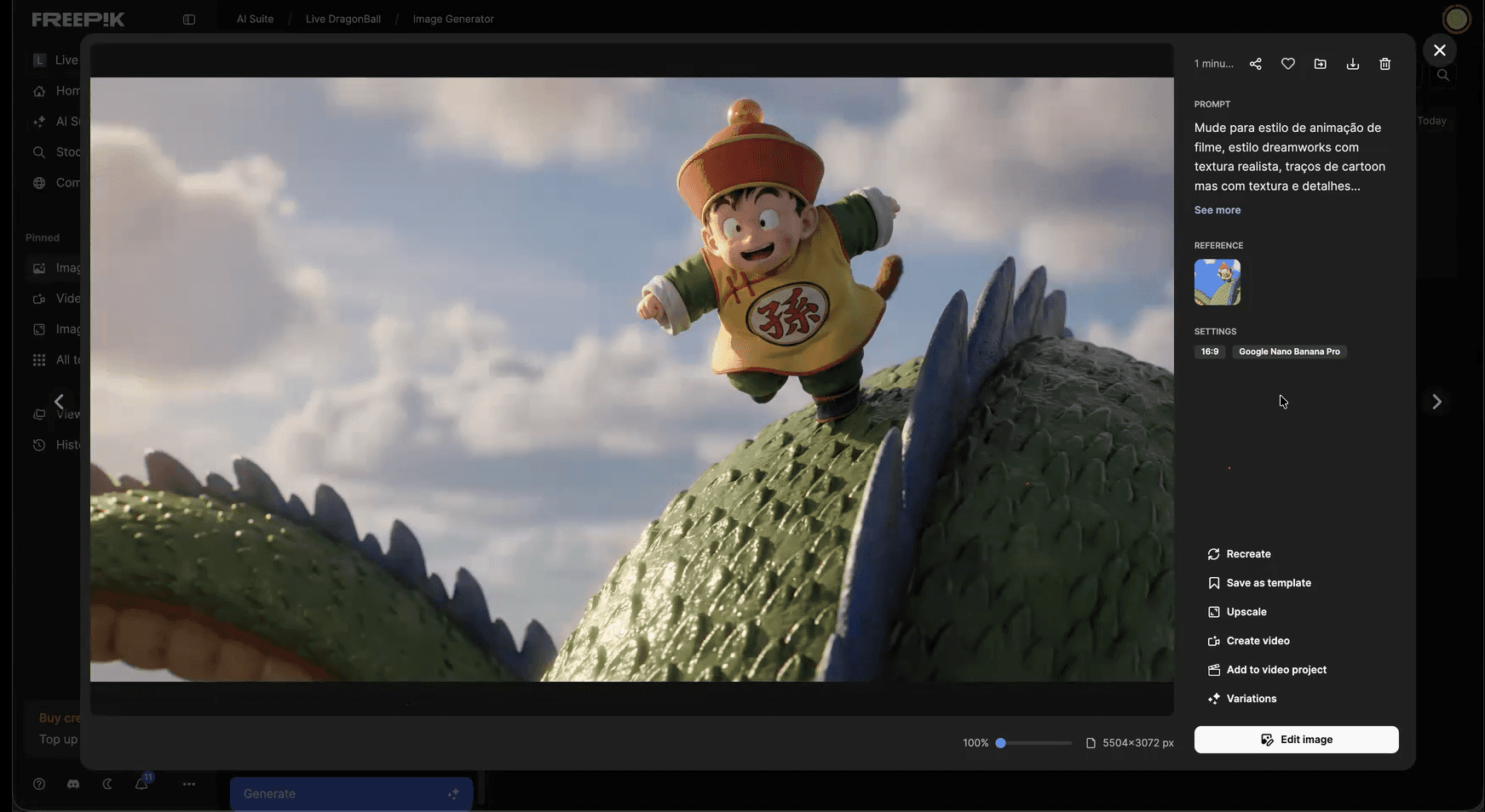 Ele se destaca por oferecer um bom controle de estilo, responder com precisão a prompts técnicos detalhados e aceitar imagens de referência com alto grau de fidelidade. Isso foi essencial para trabalhar sobre os frames já existentes da abertura original de Dragon Ball. A equipe utilizou o Nano Banana tanto através do AI Studio do Google, sua plataforma de origem, quanto através do Freepik, dependendo da velocidade de geração necessária e do tipo de recurso desejado.