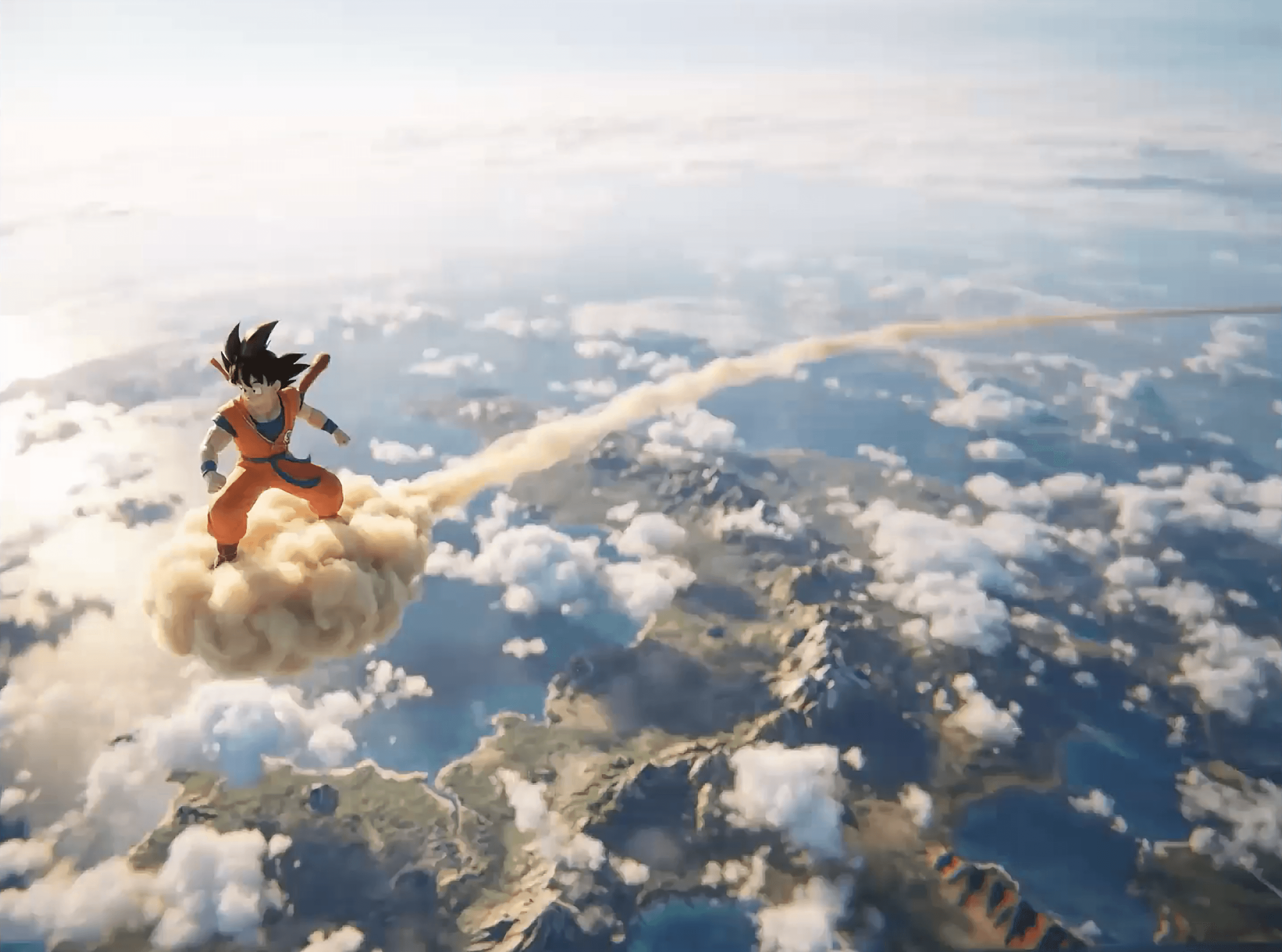 Um exemplo prático desse processo iterativo aconteceu em uma cena de close-up do Goku voando. Nos primeiros testes, a equipe simplesmente forneceu a imagem de referência da abertura original sem especificar a nuvem voadora no prompt. O resultado: Goku aparecia flutuando no ar sem suporte visível.