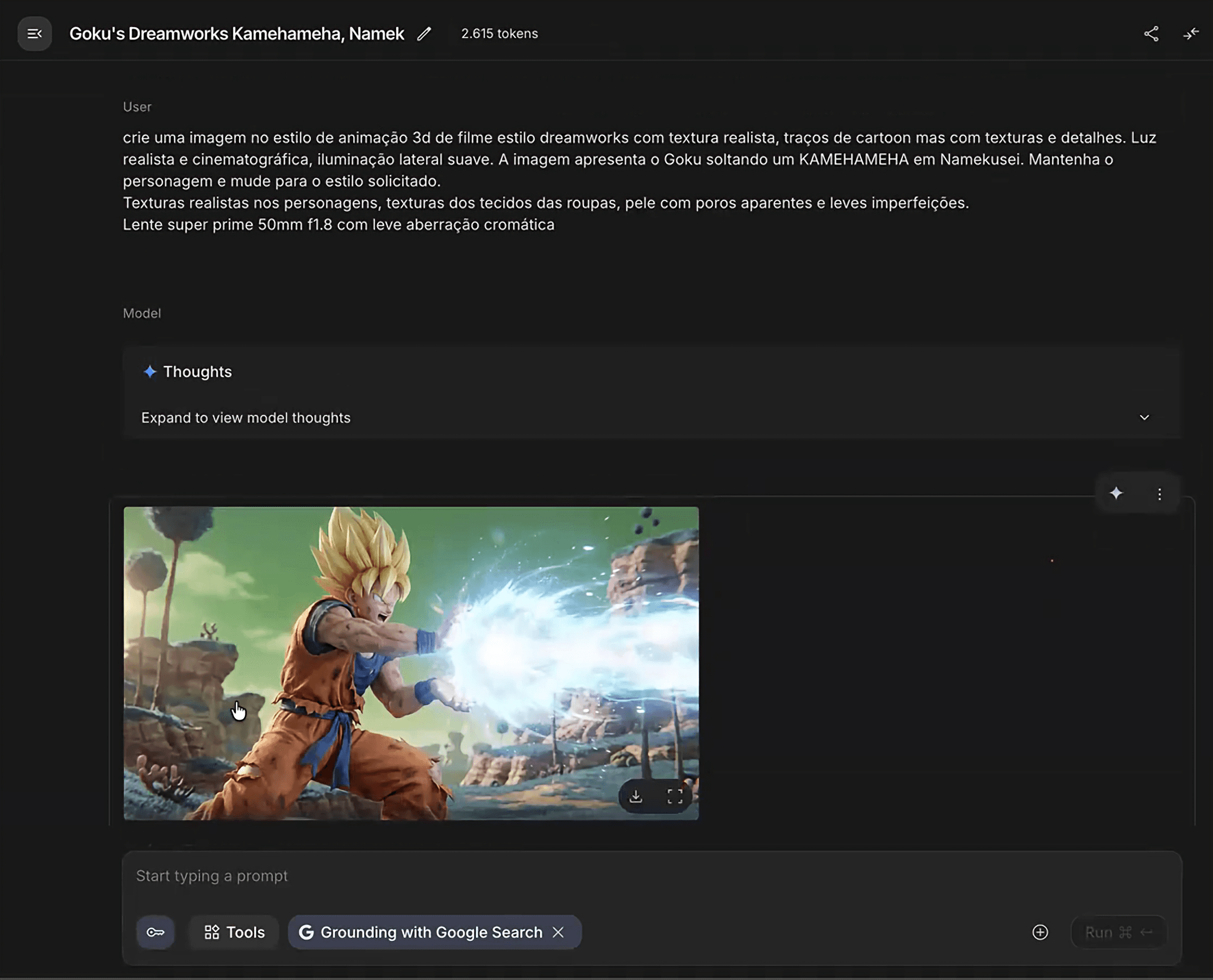 Uma funcionalidade que se mostrou particularmente poderosa foi o Ground with Google Search, disponível no AI Studio e também no Freepik. Com essa opção ativada, a ferramenta consegue buscar referências na internet para complementar o entendimento da imagem. Isso permitiu, por exemplo, usar termos coloquiais nos prompts, como "Goku lançando Kamehameha" ou mencionar nomes de personagens e locais do universo de Dragon Ball, sem precisar descrever visualmente cada elemento.