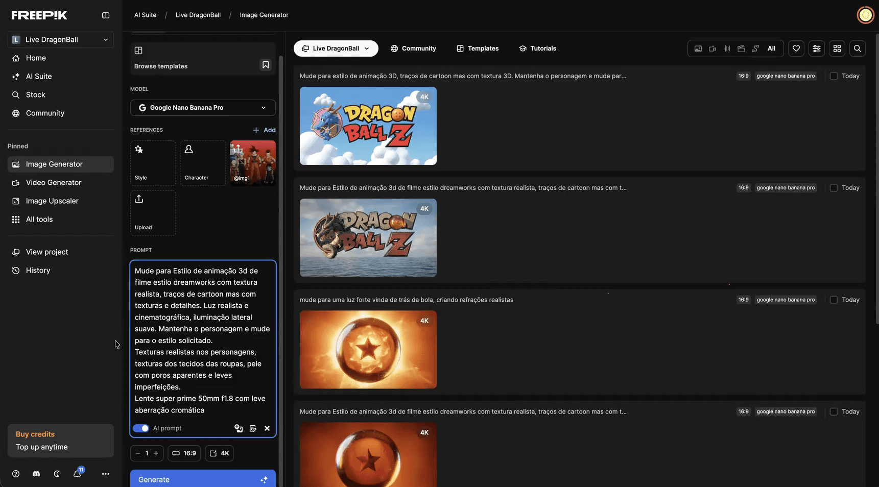 Para cada frame selecionado, a imagem original da abertura de Dragon Ball era carregada no Nano Banana junto com o prompt base. A partir daí, testes e variações eram realizados até encontrar o resultado desejado.