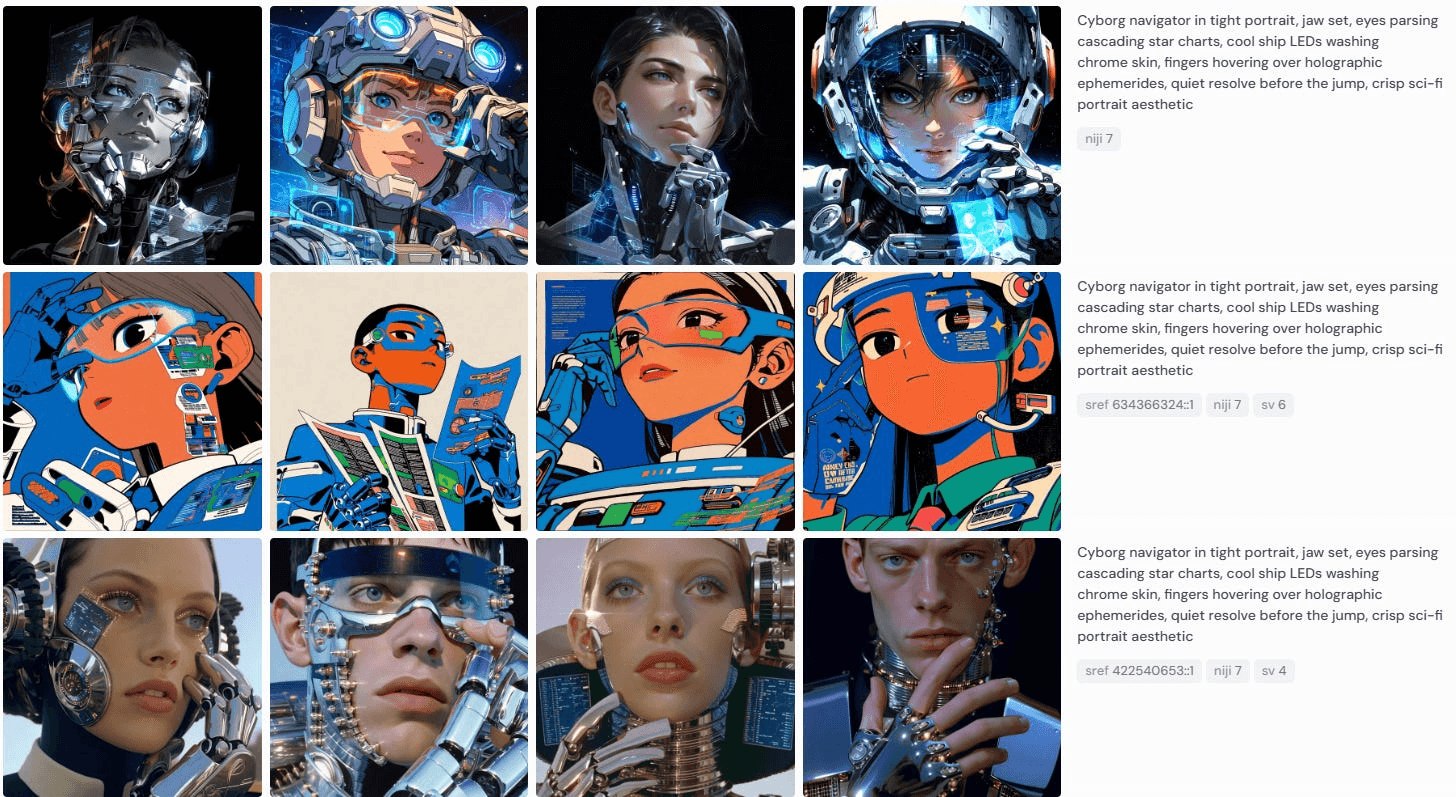 Vale destacar que o Niji 7 é um modelo “opinativo”, mantendo uma assinatura estética japonesa mesmo fora do contexto de anime. Para quem busca resultados mais neutros, parâmetros como --style raw ajudam a reduzir essa estilização automática, ampliando o controle artístico sem perder precisão.