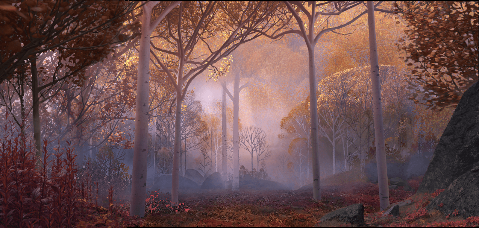 Sistemas procedurais como Bonsai e Flourish completaram o processo, gerando vegetação em larga escala e movimentos sutis de folhas e galhos, sempre com controle artístico, evitando simulações pesadas e imprevisíveis.