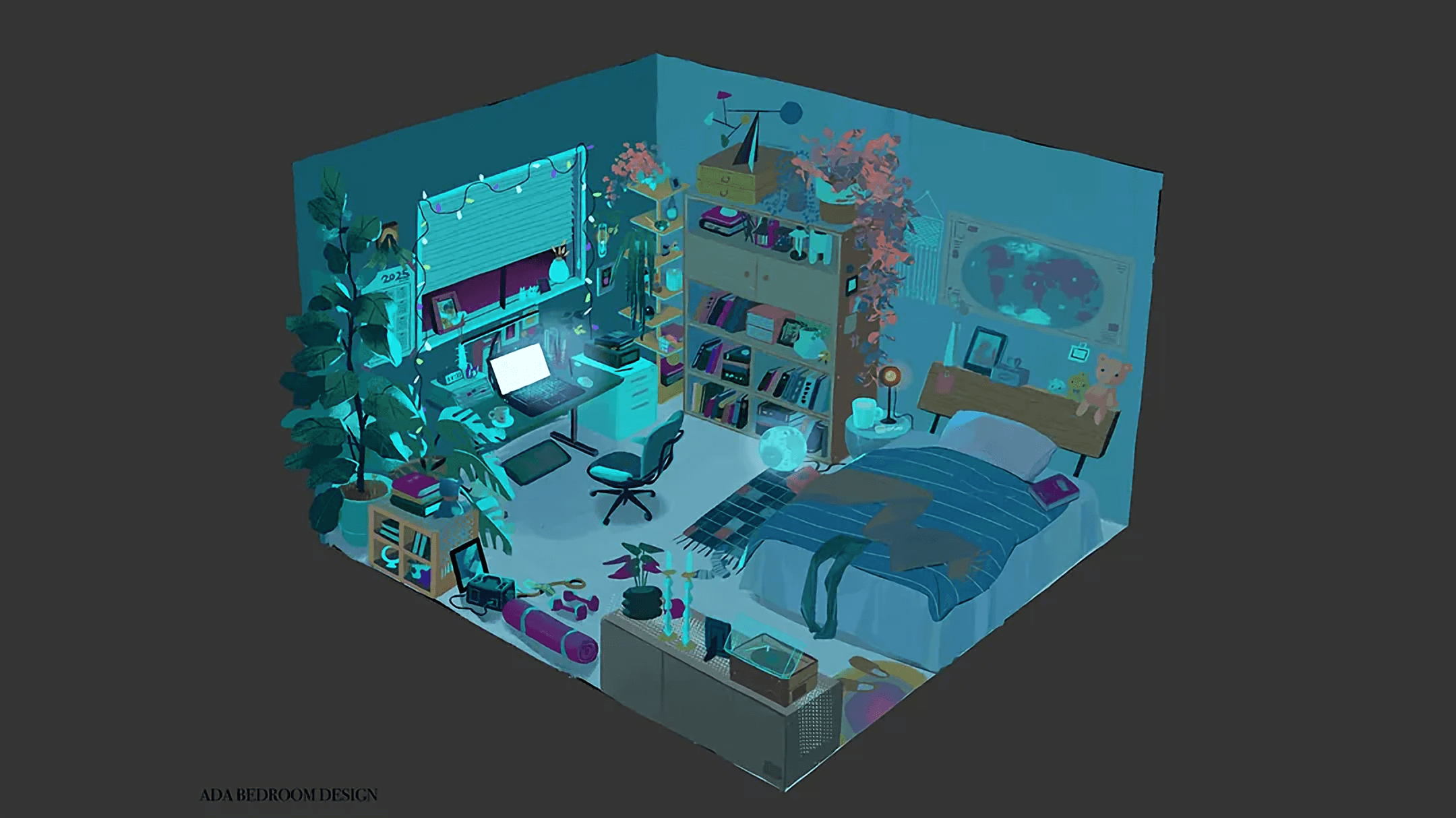 O quarto de Ada foi renderizado em cores frias, transmitindo uma sensação de calma, conforto e refúgio, um contraste deliberado com o caos que vem do andar de cima.