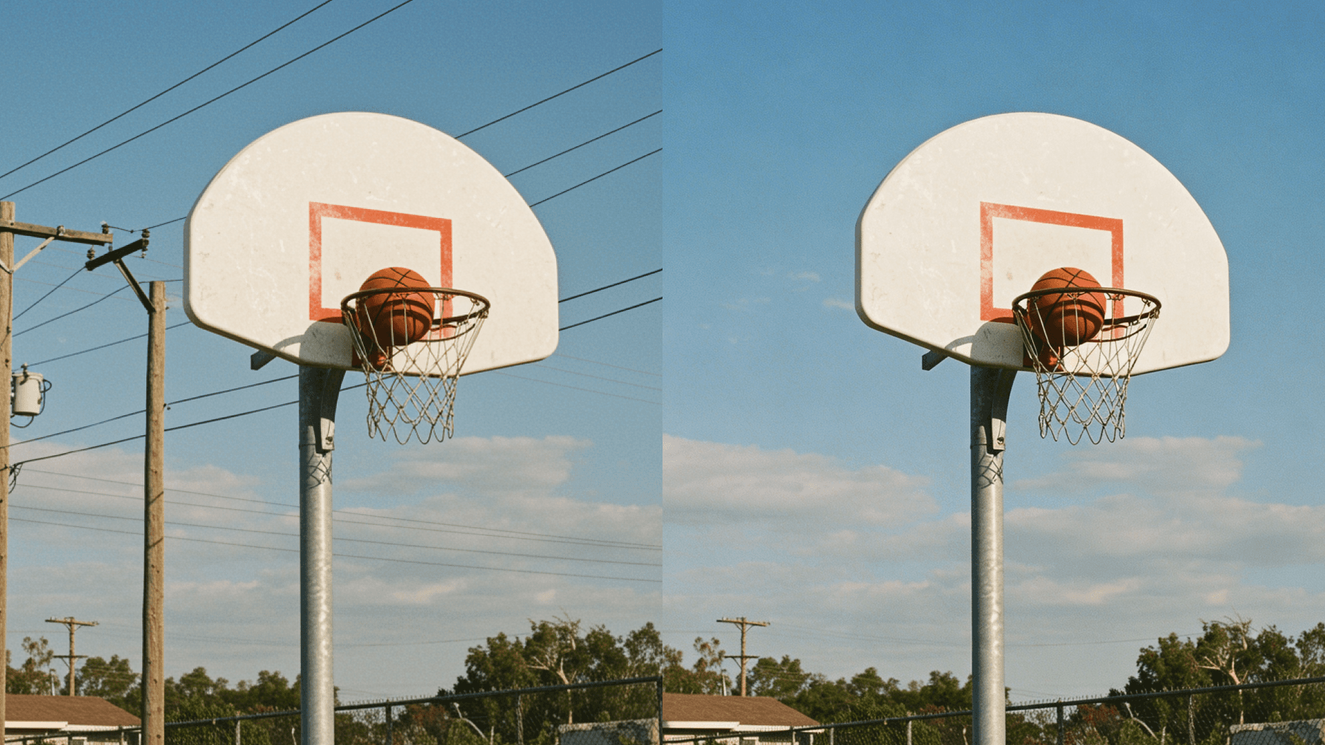 O mesmo vale para remoções em cenários abertos. Em vez de “tirar fios”, descreva: “remover os fios elétricos que cruzam o céu atrás da tabela de basquete, reconstruindo o fundo com céu azul contínuo e nuvens suaves, preservando a iluminação natural da cena e a profundidade do horizonte”. Assim, você orienta o modelo não só sobre o que deve desaparecer, mas sobre como o espaço precisa ser reconstruído para que a imagem continue natural.