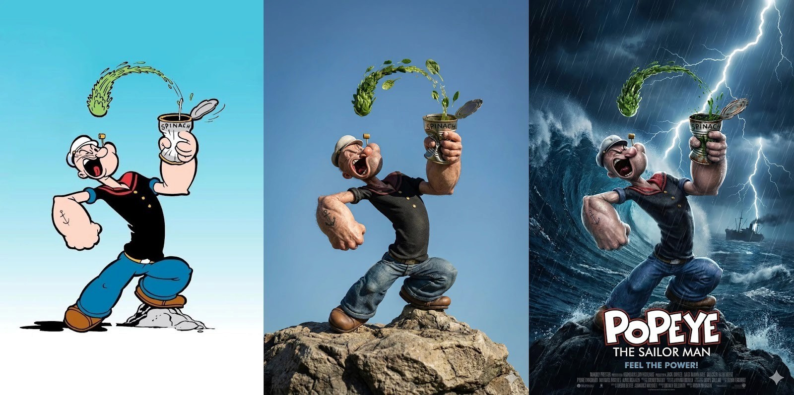 “Primeiro, eu baixei a imagem do desenho do Pinterest e deixei ela ultra realista usando o Nano Banana. Depois, peguei essa foto e usei outro prompt pra transformar num pôster de filme nível comercial do Popeye.”