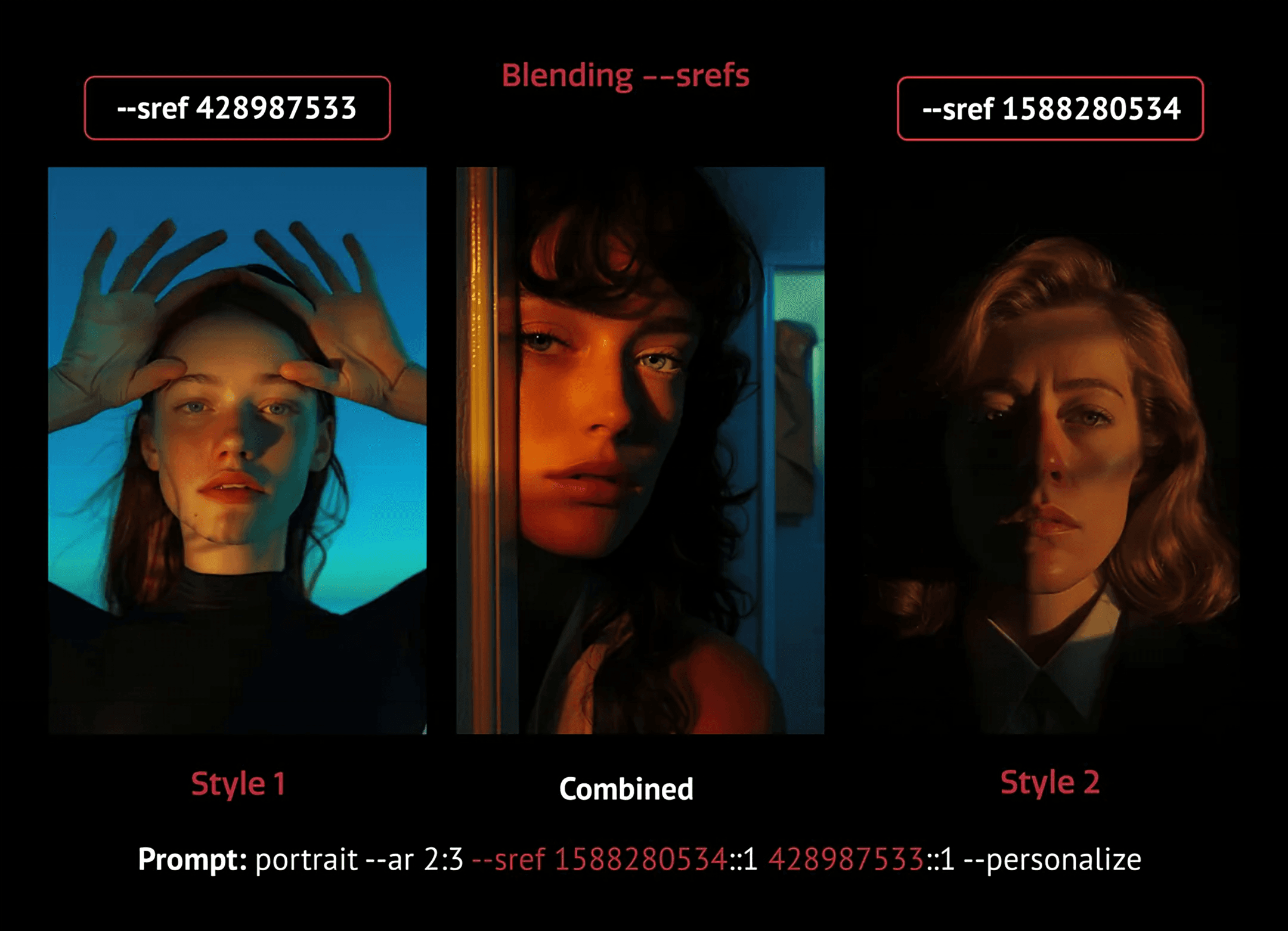 O --sref também permite usar mais de uma referência ao mesmo tempo. Em vez de escolher um único estilo, você pode combinar dois ou mais e gerar um estilo novo a partir dessa mistura.