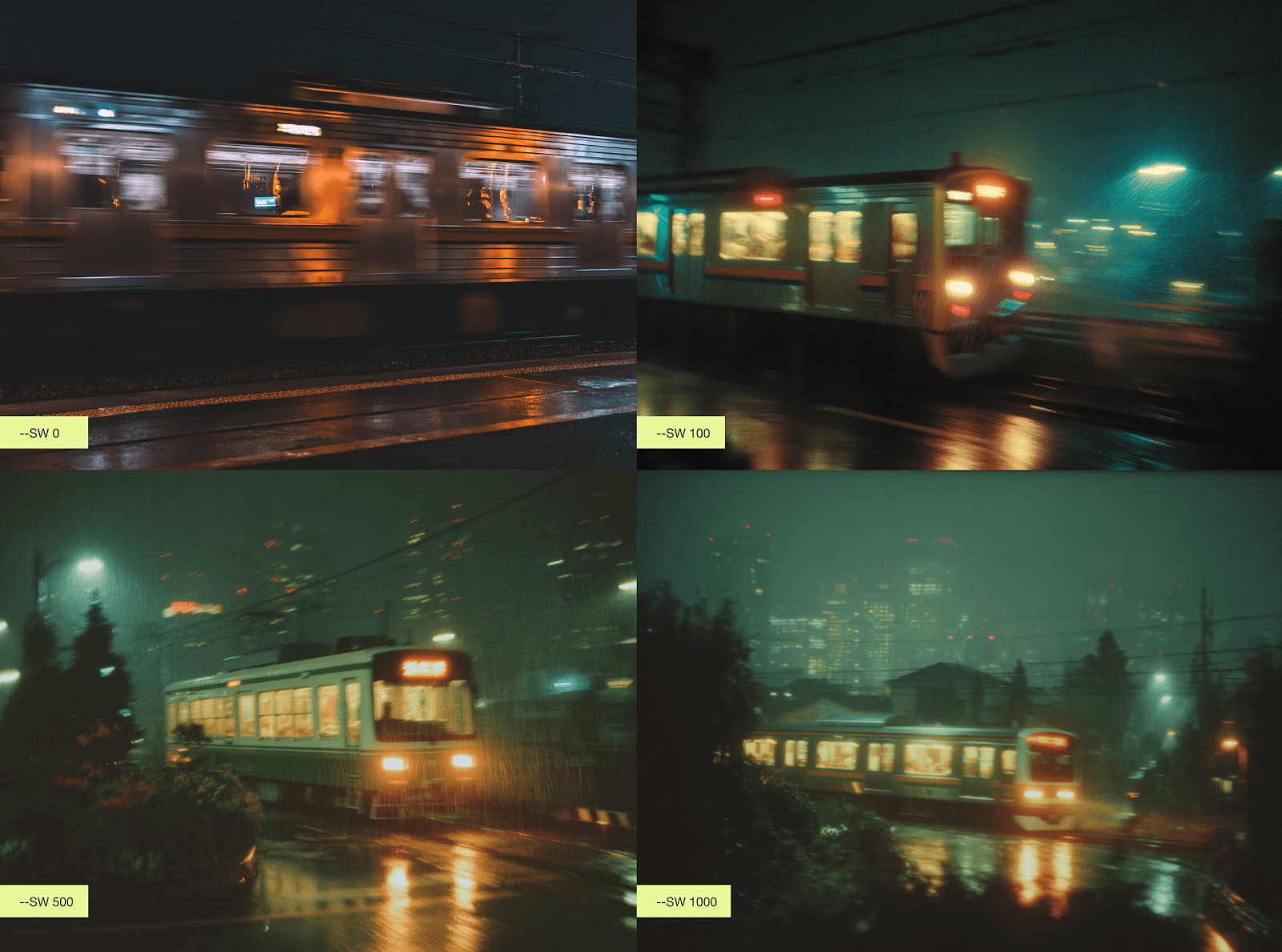 Com valores mais baixos, como --sw 25 ou --sw 50, o estilo entra de forma mais leve. O modelo segue o prompt com mais liberdade e interpreta a referência sem ficar preso a ela.