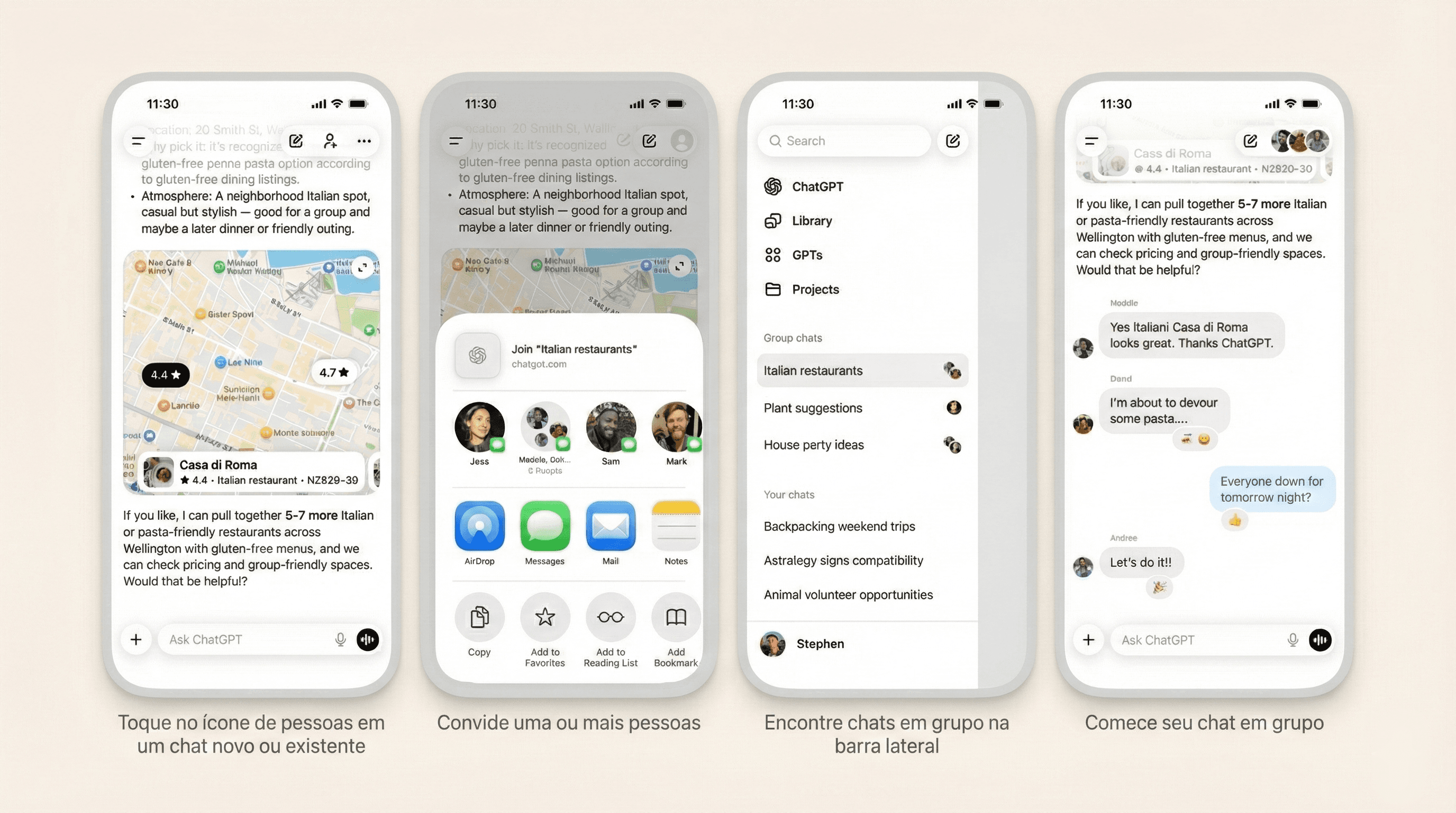 Para criar um grupo no ChatGPT, basta tocar no ícone de pessoas no canto superior direito de qualquer conversa e adicionar os participantes. Quando o recurso está ativo, o novo grupo aparece automaticamente em uma seção própria na barra lateral, separado dos chats privados.