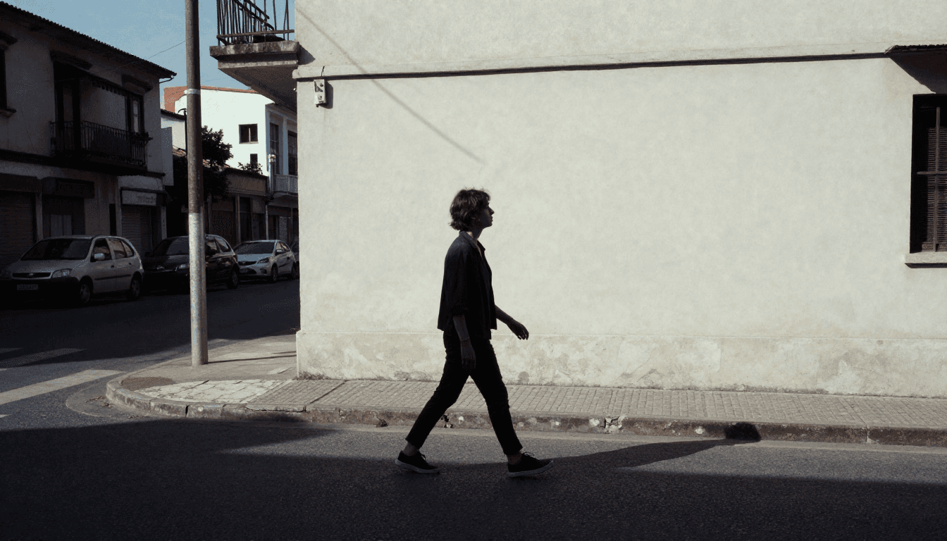 "plano médio, pessoa caminhando em rua urbana, fotografia documental, iluminação natural dura, sombras contrastadas, cor dessaturada com toque de grão de filme 16mm, composição descentrada seguindo regra de terços, estética de cinema de autor, sem filtros digitais"