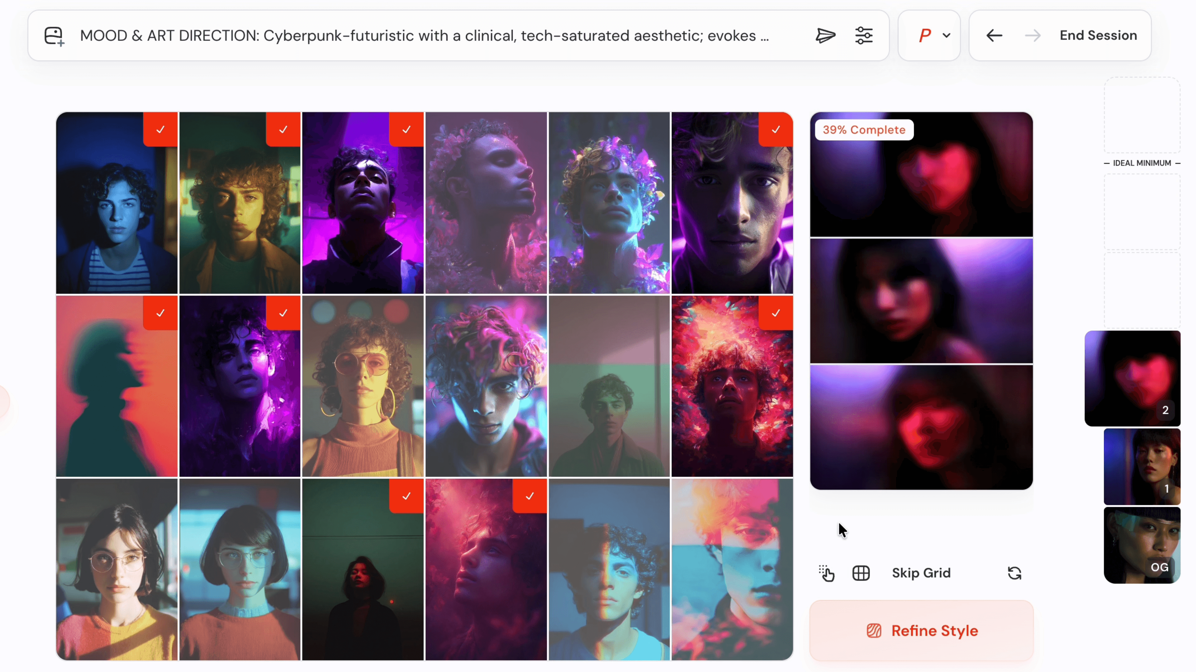A cada etapa, ele gera novas ideias até chegar no estilo que você quer. Ao concluir o refinamento, você pode clicar em "finalizar sessão" para obter o código SREF único do estilo criado.