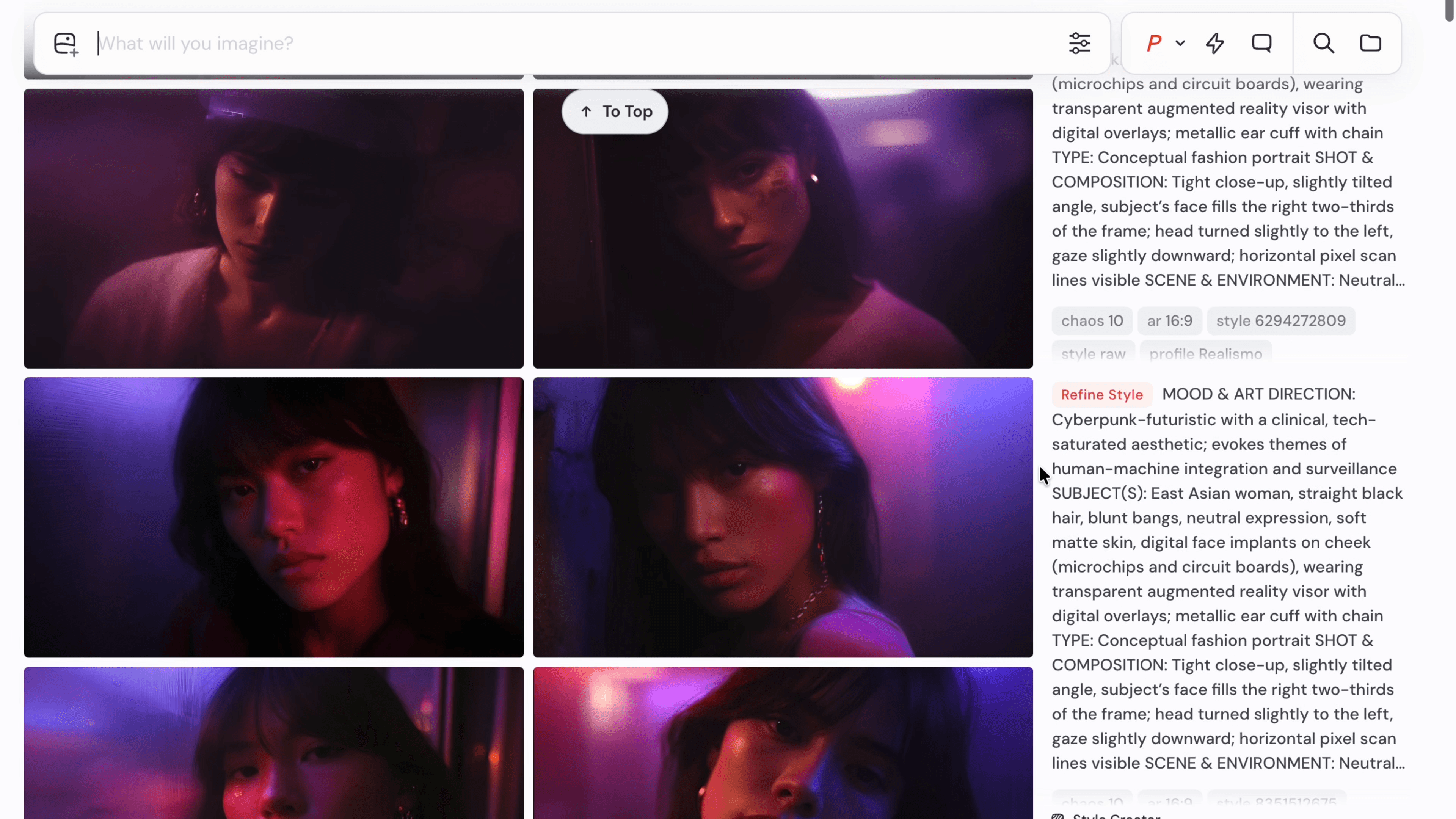 O Midjourney então converte suas escolhas em um novo código SREF e você recebe outra grade de imagens para refinar ainda mais os resultados.